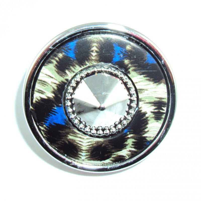 Bouton imprimé léopard à pic faceté au centre, contour argenté, queue à l'arrière