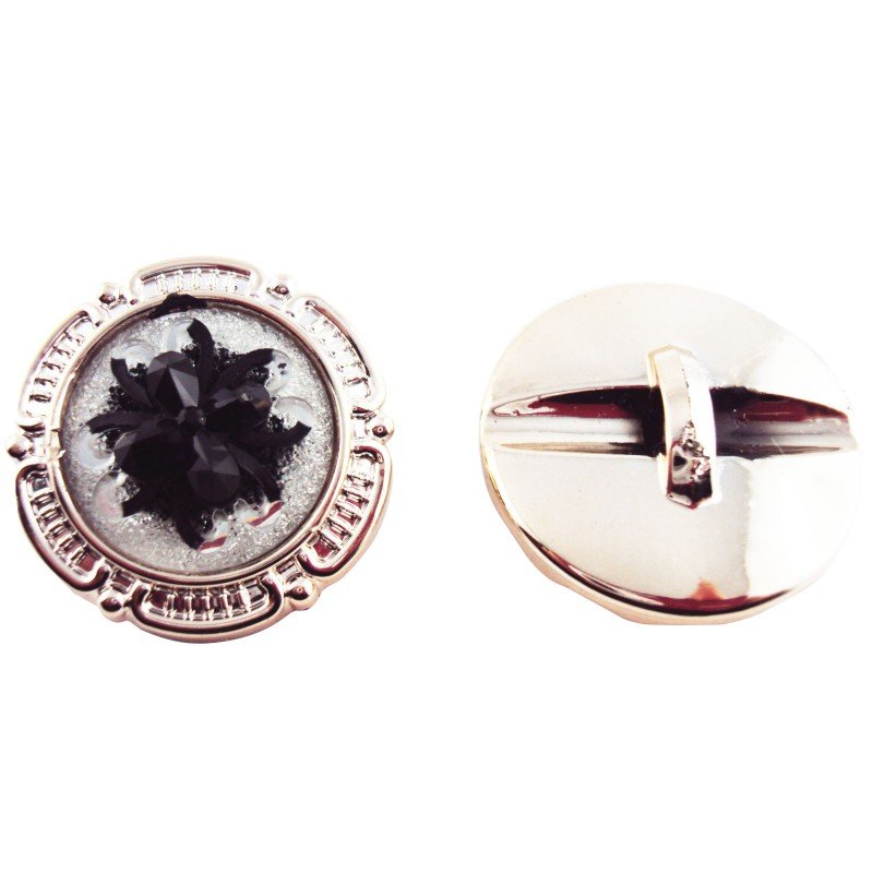Bouton doré avec fleur en strass noir en son centre, avec fond pailleté, queue à l'arrière