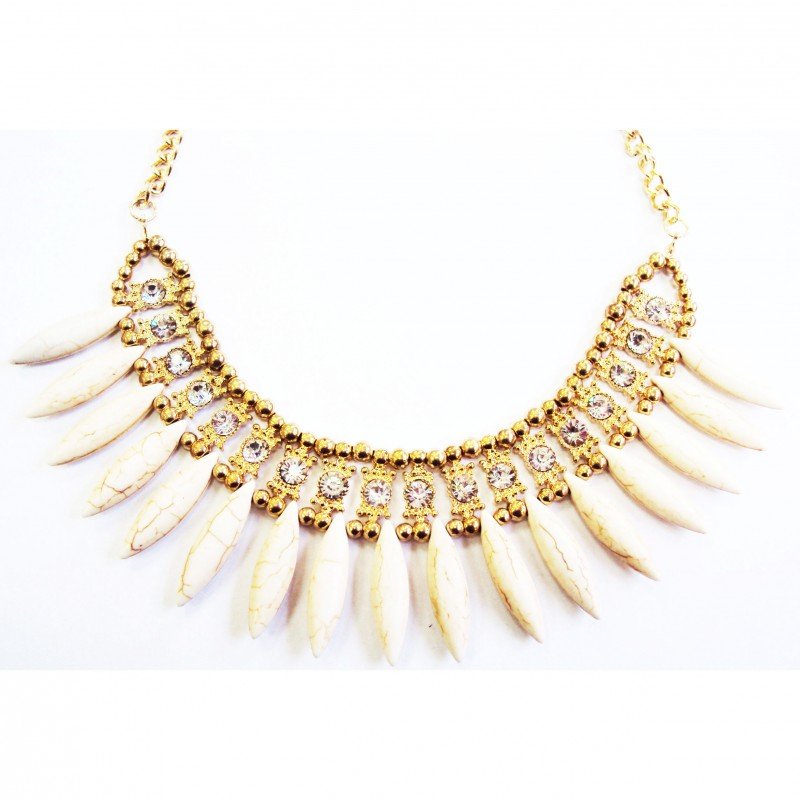 Collier plastron en véritable pierre naturelle de turquoise de couleur blanche taillée en pointe et serti de cristal zircon brillant
