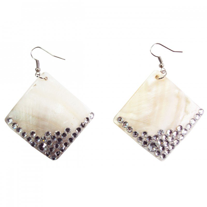 Boucles d'oreilles forme losange en nacre épaisse sertie de strass transparent