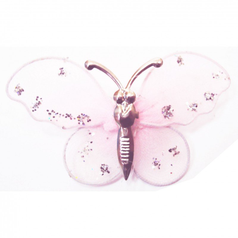 Broche en métal malléable au motif papillon, tissu mousseline à paillettes.