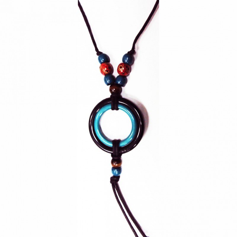 Sautoir fantaisie composé de perles synthétiques et perles de bois avec en pendentif deux anneaux turquoise/noir en pvc